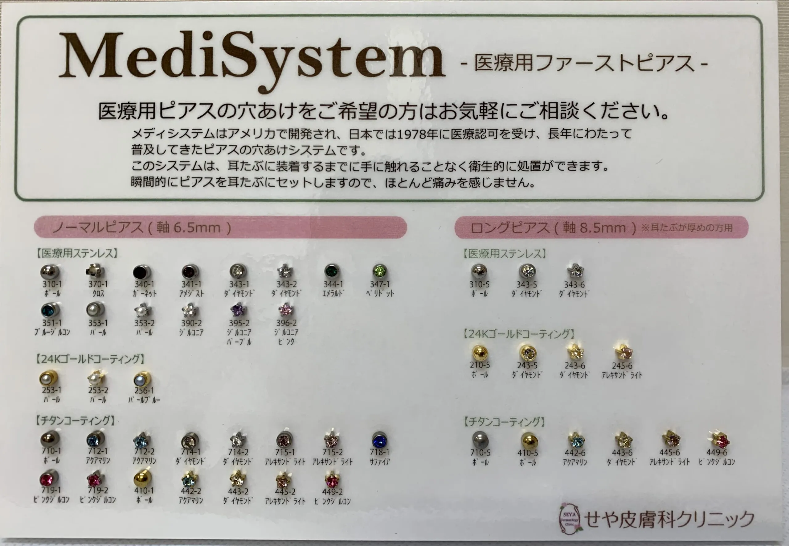 当院では、耳たぶのピアスのみに対応しております。 ピアスはチタン製のものを取り扱っておりますので、金属アレルギーの方も安心です。 未成年の方が施術を受けられる際には、保護者の方の親権者同意書が必要です。